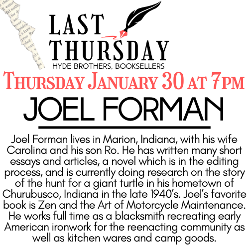 Joel Forman lives in Marion Indiana with his wife Carolina and his son Ro. He has written many short essays and articles, a novel which is in the editing process, and is currently doing research on the story of the hunt for a giant turtle in his hometown of Churubusco, Indiana in the late 1940’s. Joel’s favorite book is Zen and the Art of Motorcycle Maintenance. He works full time as a blacksmith recreating early American ironwork for the reenacting community as well as kitchen wares, and camp goods.