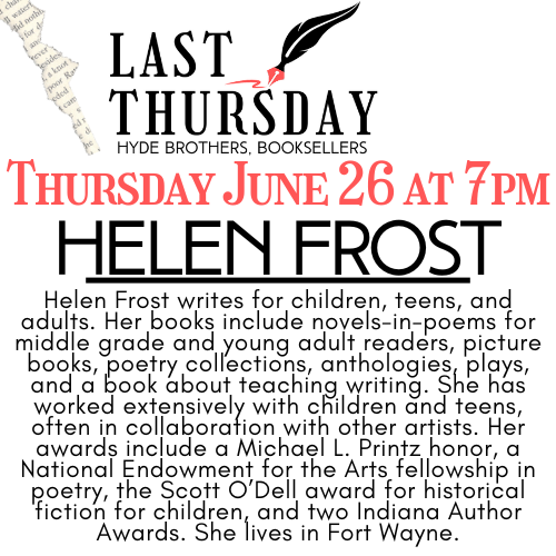 Helen Frost writes for children, teens, and adults. Her books include novels-in- poems for middle grade and young adult readers, picture books, poetry collections, anthologies, plays, and a book about teaching writing. She has worked extensively with children and teens, often in collaboration with other artists. Her awards include a Michael L. Printz honor, a National Endowment for the Arts fellowship in poetry, the Scott O’Dell award for historical fiction for children, and two Indiana Author Awards. She lives in Fort Wayne.