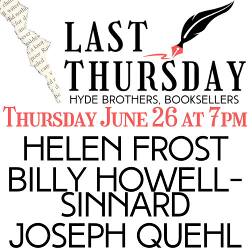 Last Thursday at Hyde Brothers Booksellers, Thursday June 26th 2025 at 7pm featuring readers Helen Frost, Billy Howell-Sinnard and Joseph Quehl