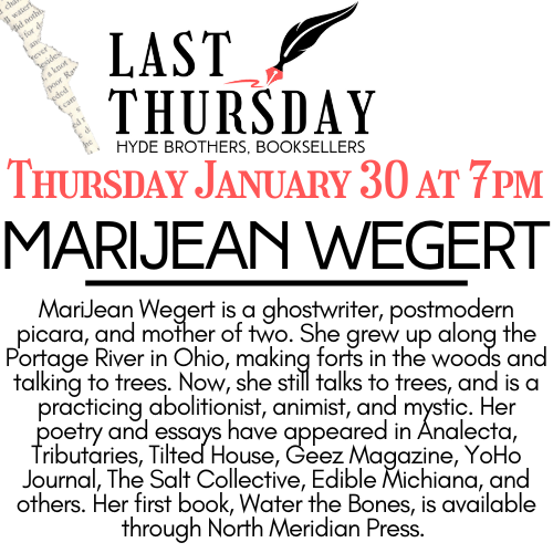 MariJean Wegert is a ghostwriter, postmodern picara, and mother of two. She grew up along the Portage River in Ohio, making forts in the woods and talking to trees. Now, she still talks to trees, and is a practicing abolitionist, animist, and mystic. Her poetry and essays have appeared in Analecta, Tributaries, Tilted House, Geez Magazine, YoHo Journal, The Salt Collective, Edible Michiana, and others. Her first book, Water the Bones, is available through North Meridian Press.
